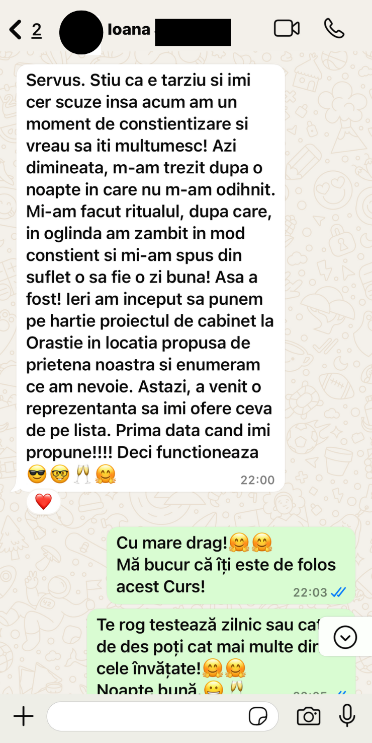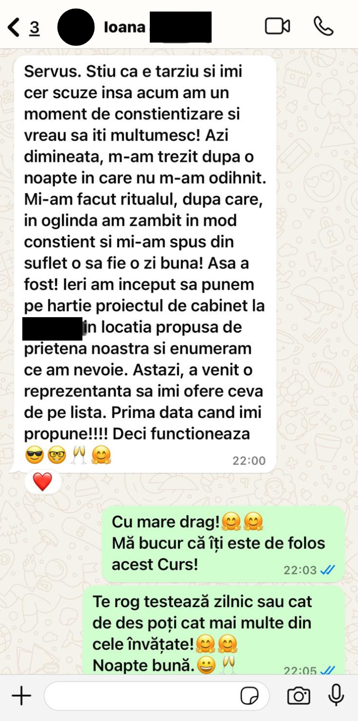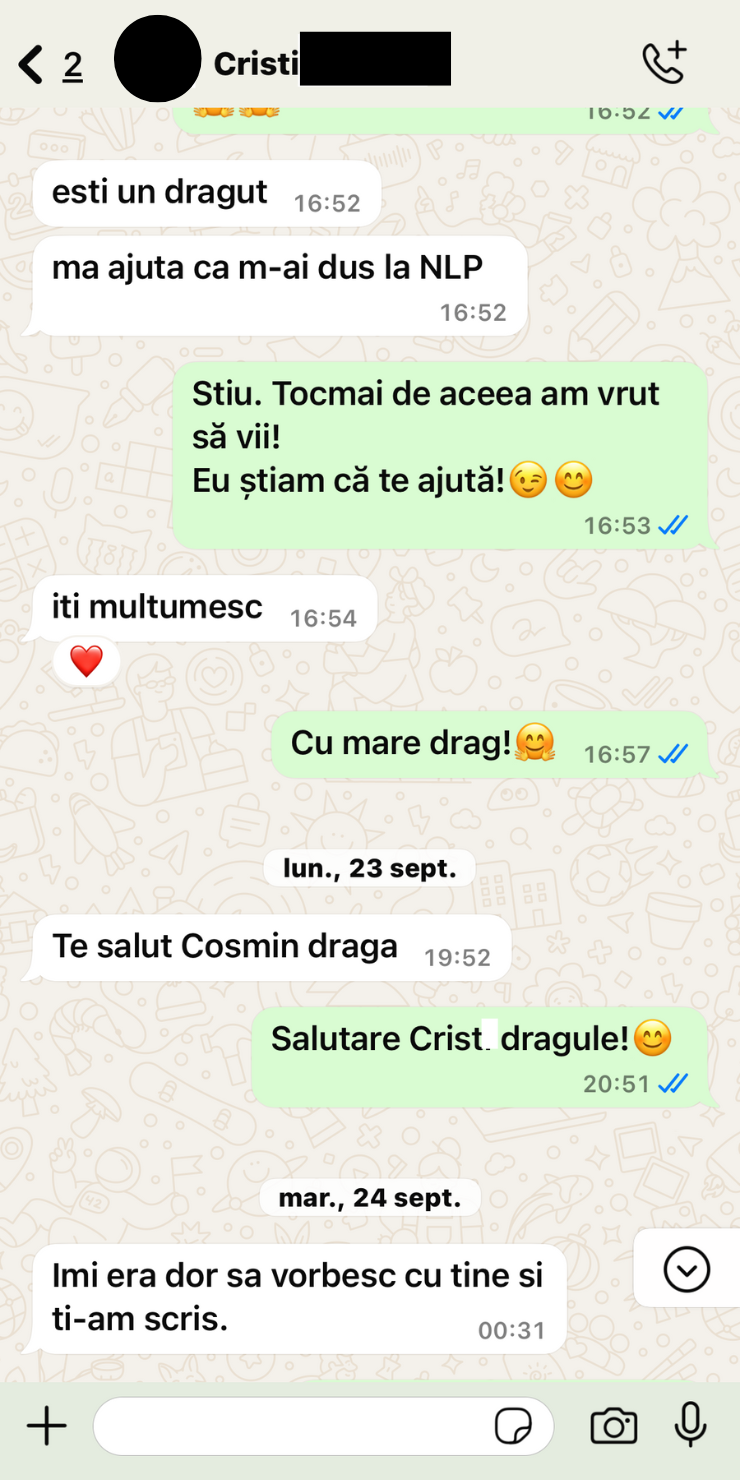 Și eu am trecut prin aceste șocuri inevitabile ale vieții și pot să spun că datorită și cu ajutorul Programării Neuro-Lingvistice am reușit să-mi recapăt controlul asupra întregii vieți, cu bucurie și ușurință.