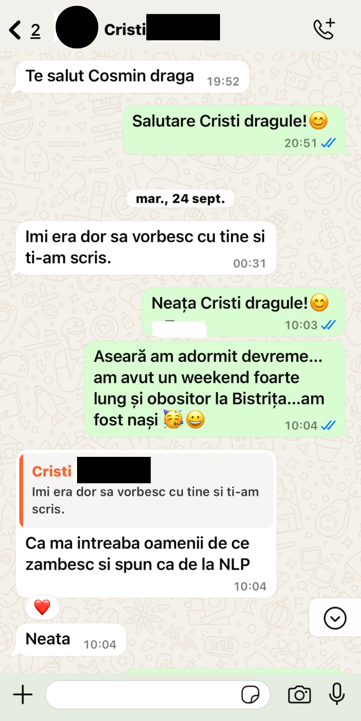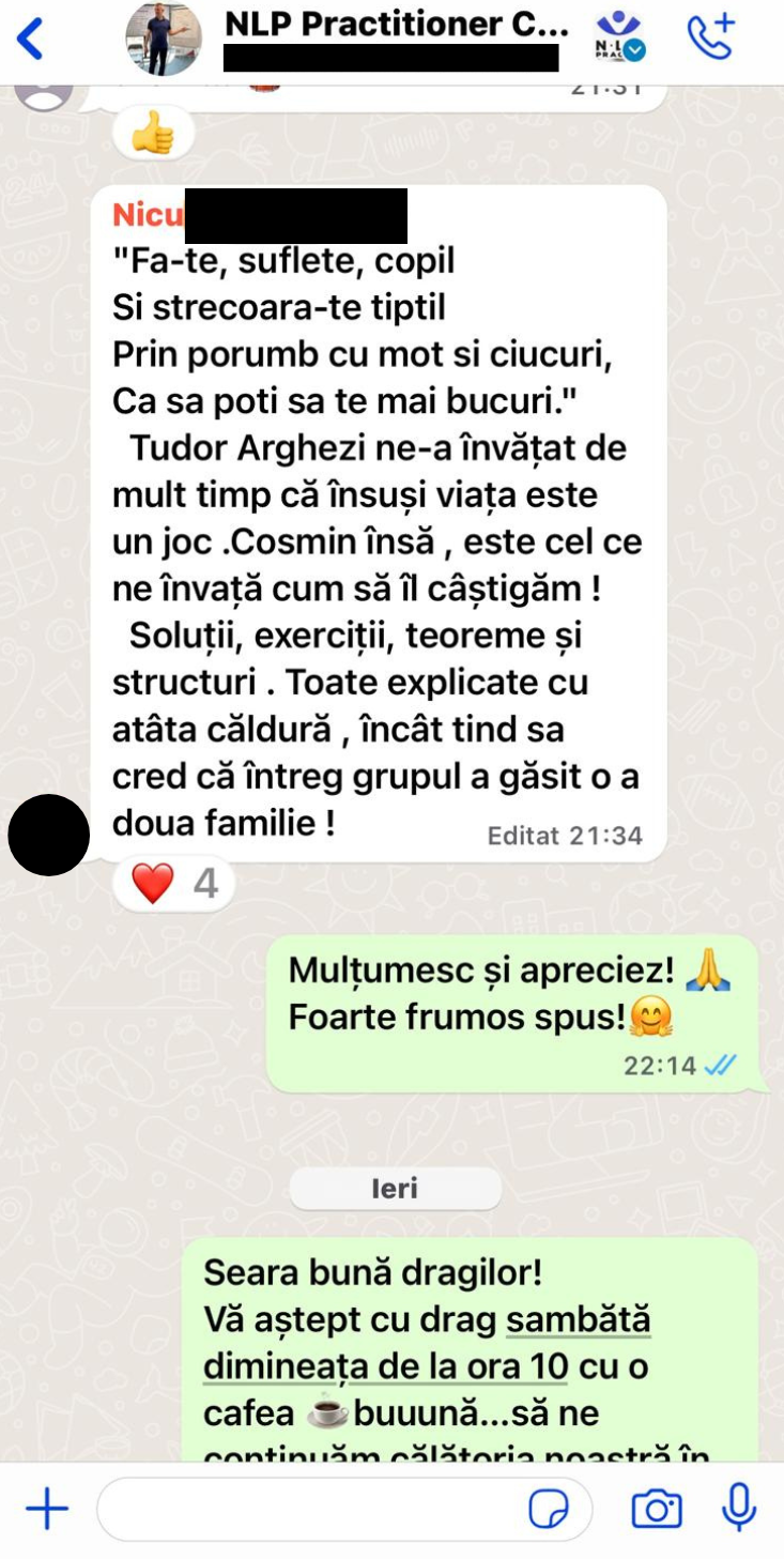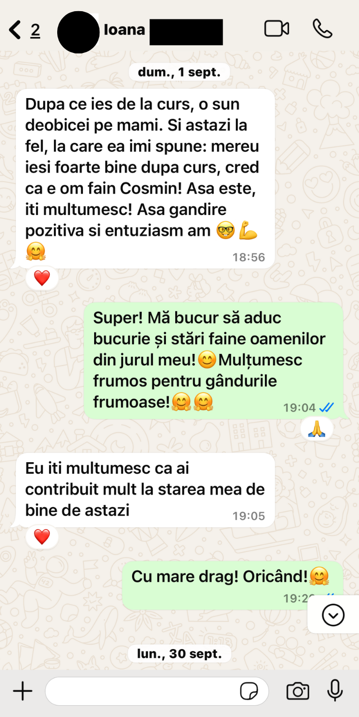 Și eu am trecut prin aceste șocuri inevitabile ale vieții și pot să spun că datorită și cu ajutorul Programării Neuro-Lingvistice am reușit să-mi recapăt controlul asupra întregii vieți, cu bucurie și ușurință.