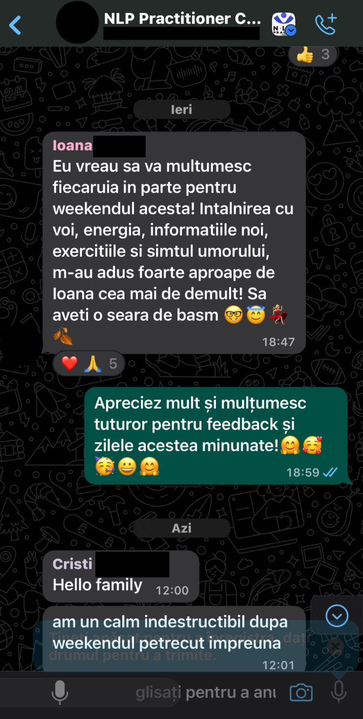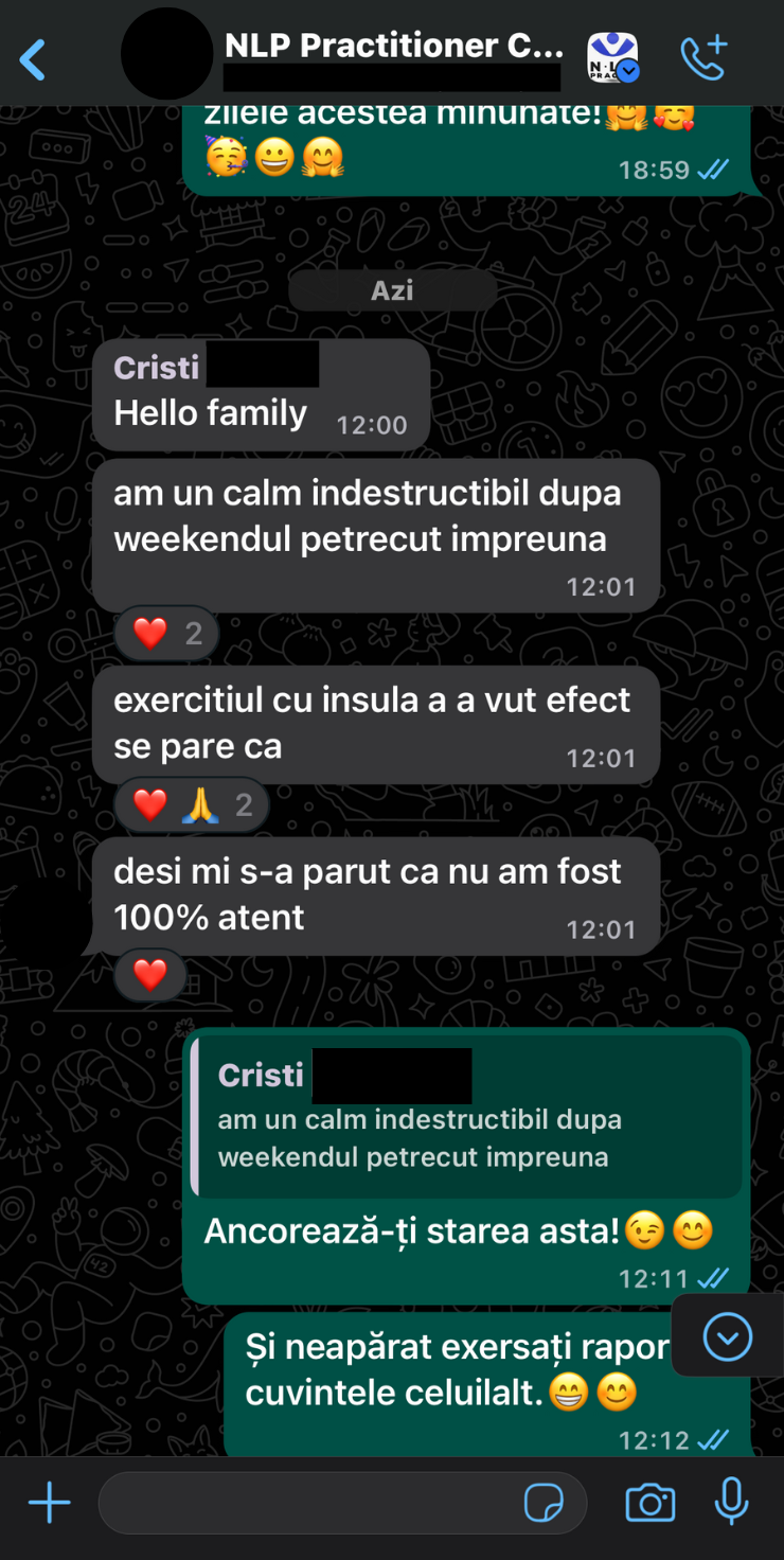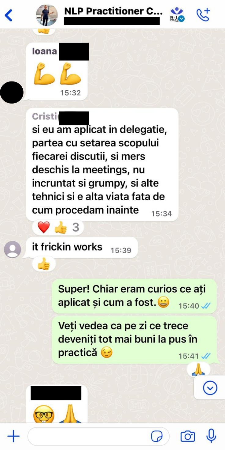 Participanții car evor să-și reîmprospăteze cunoștințele vor beneficia de acces pe VIAȚA la orice Curs NLP Practitioner făcut de mine